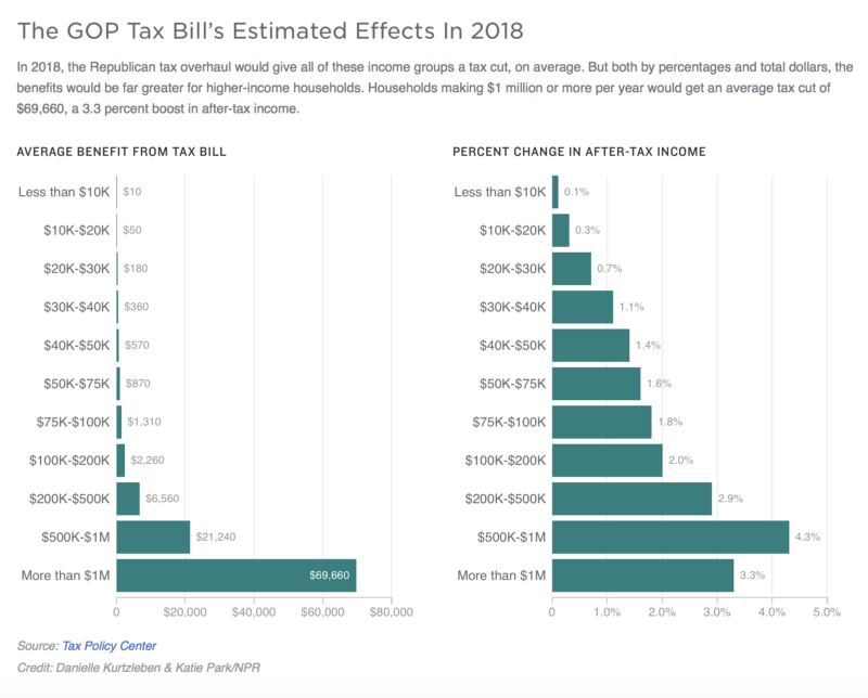 Before we even discuss whether or not the tax plan will benefit anyone, it’s very important to note that all the cuts for people are set to expire in 2025. As this article poignantly notes: “enjoy your tax cuts while they last.” Any amount of savings you may be seeing in the coming years will go away without further action from Congress. Meanwhile, those tax cuts for businesses are permanent. Let that sink in for a minute.